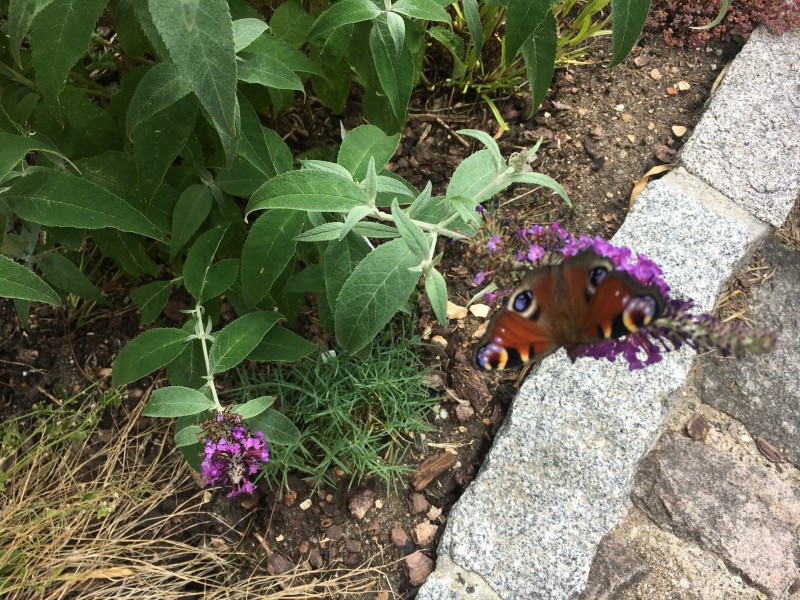 Bei uns flogen heute immerhin drei Rapsweißlinge, ein Zitronenfalter und ein Ochsenauge. Und morgens konnte ich einen Admiral beim Sonnenbad beobachten. Das ist für hiesige Verhältnisse schon fast eine Invasion.