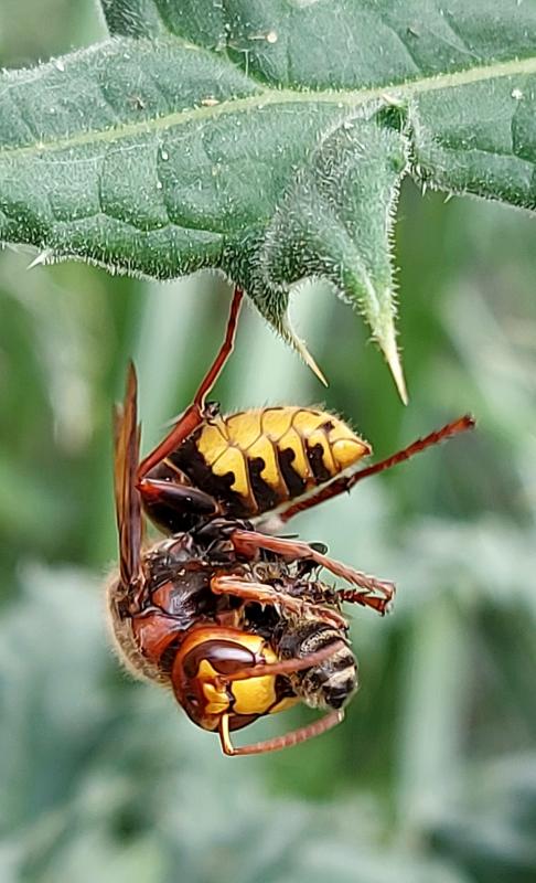 Diese hier hing mit ihrer Beute, einer Honigbiene, bald 2min an einem Bein am Distelblatt, um ein handliches Päckchen zu schnüren, während sie mit dem anderen Hinterbein ein paar winzige aufdringliche Fliegen verscheuchte, die sich auch für die Biene interessierten.