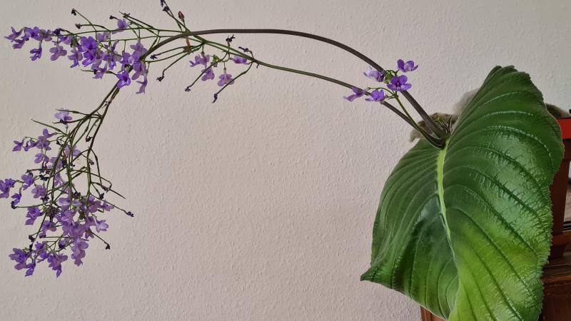 Hier ist's mittlerweile auch wieder losgegangen. Indoor blüht Kohleria 'Queen Olympus', rechts unten der winzige lila Fleck ist Sinningia pusilla, während es bei Seemannia nematanthodes 'Evita' im Hintergrund noch ein bissel dauert. (Letztere taucht als „Unkraut“ mittlerweile auch in anderen Töpfen auf :-X)
