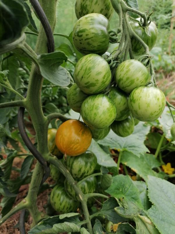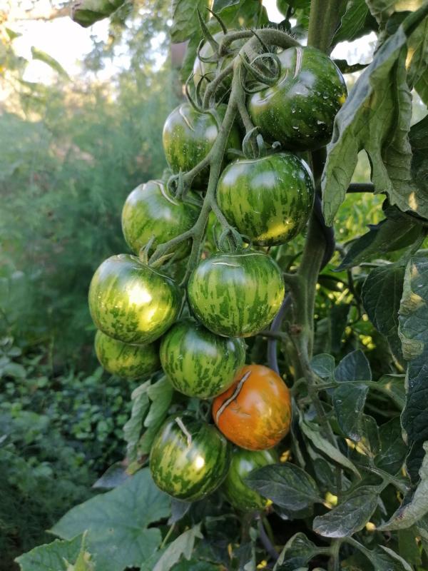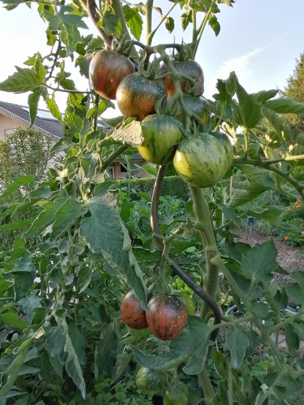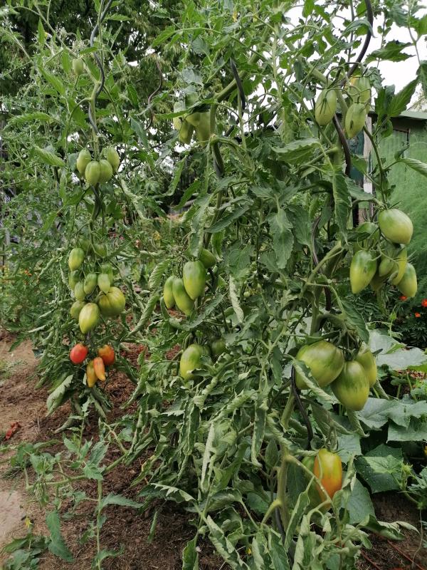 Wahnsinn, was da dranhängt. Gute rundfrüchtige, sehr hübsch und geschmacklich gut, etwas fleischig auch. Keine Blütenendfäule, ein paar Platzer.