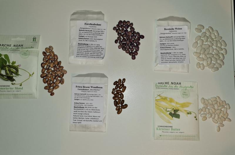 Und die Sorten. Wie Edelsteine. Eine serbische Wachtelbohne und die Meterbohne kamen noch dazu. Die niederländische ist eine Buschbohne.