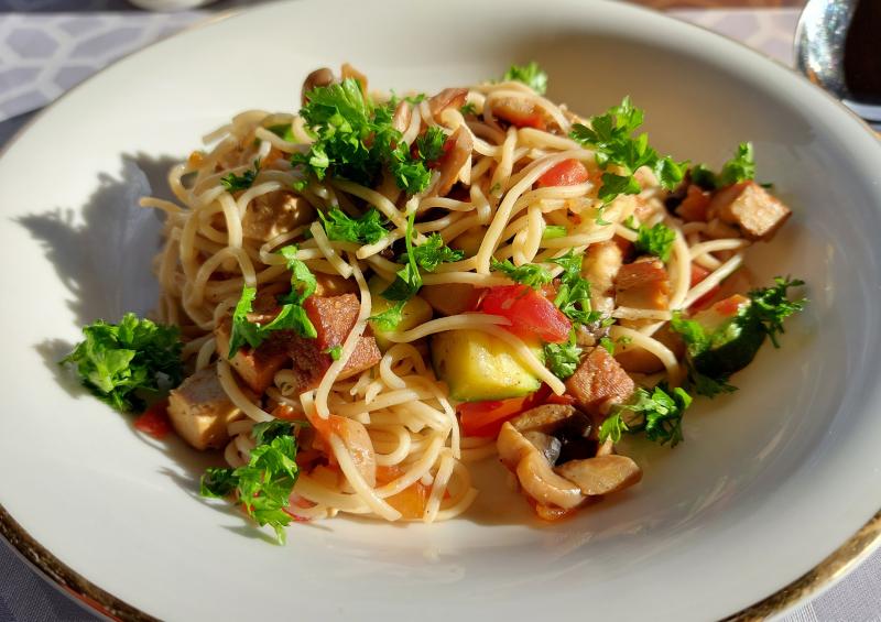 Mie-Nudeln mit Räuchertofu, Zucchini, Champignons und Tomaten, dazu gemischten Salat