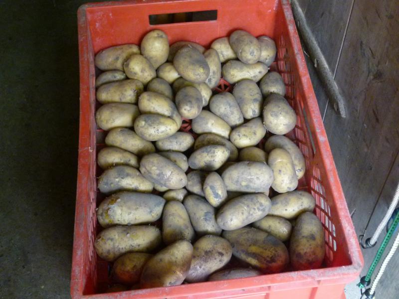 Hier wurde letzte Woche die Corinna vom Acker geholt. Mit dem Tiefenlockerer kamen auch unversehrte Knollen neben den aussortierten zutage. So stehen jetzt 5 Kisten rum, zum Glück nicht bei mir.