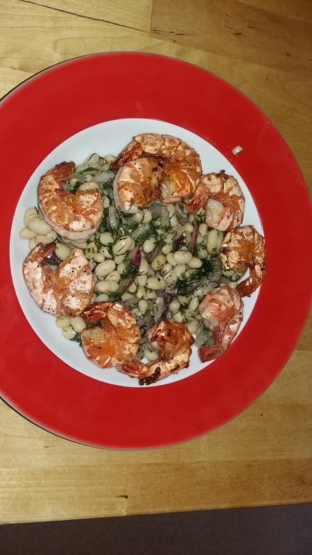 Salat mit weißen Bohnen, roter Zwiebel, Petersilie und Dill. Darüber gebratene Garnelen und dazu Tomatenciabatta.