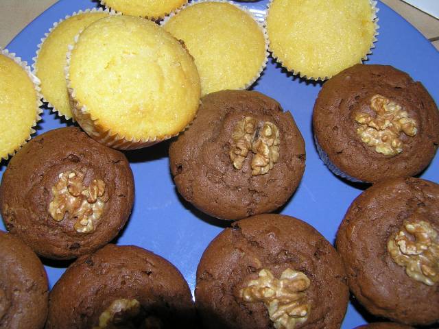 @natura, für muffins nehm ich immer das gleiche rezept wie für gerührten kuchen, nur die hälfte davon, also125g butter125g zucker2-3 eier250g mehl1 gehäufter tl backpulverfür die schoko-walnuß-muffins habe ich zwei stücke zartbitter blockschokolade aufgelöst und walnüsse zerhackt und kurz angeröstet und mit in den teig und mit etwas zimt und kardamom abgeschmeckt.eine walnusshälfte aufgesetzt und gebacken.für die mit mandarinen habe ich mandarinen filetiert (gehen auch die aus der dose, hatte aber noch so viel frische da), eine halbe zitrone ausgepresst, den saft zum teig, den angefallen mandarinensaft noch dazu und zum schluß die mandarinenfilets untergehoben.ab in die förmchen und auch gebacken.