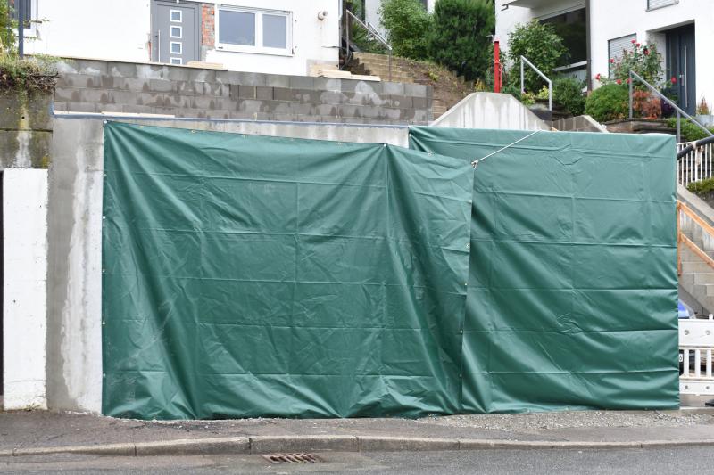 Mir fehlt irgendwie die Vorstellungsgabe, verbergen sich hinter den Planen mehrere Beton-Terrassen und eine hohe Mauer als Abschluss zu Gehweg und Straße?