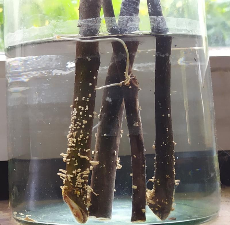 Stecklinge und Steckhölzer übern Winter haben nicht funktioniert. Da aber immer Schnittmaterial anfällt, habe ich vier Stücke letzte Woche in Wasser gestellt. Das sieht ganz gut aus und die Triebe kriegen unten kleine weiße Nöppel, die Vorstufe von Wurzeln.