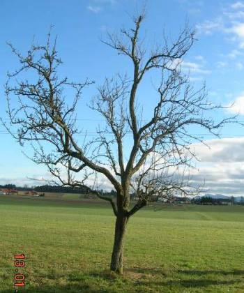Der Baum sieht arm aus, aber vielleicht will ihn der Besitzer umveredeln und hat deshalb so viel abgeworfen? Ich war gestern bei einem sehr interessanten Obstbaumschnitt-Nachmittag unseres Gartenstammtisches, wo uns der nette Gastgeber durch seinen sehr gepflegten großen Obstgarten führte , uns mit Reisern eindeckte und zum Schluss zur Verkostung vieler seiner herrlichen Apfelsorten einlud. Er übernahm vor vielen Jahren den Obstgarten seines Vaters und veredelt auf die alten Bäume immer wieder neue (und vor allem auch alte) Sorten dazu. In einem Diavortrag zeigte er uns diese Bäume früher einmal in der Blütezeit und im vollen Fruchtbehang. Am meisten angetan waren wir damals von einem alten Birnbaum, der über und über voller großer wunderschöner Birnen hing. So sieht dieser Baum, auf dem 20 Sorten wachsen, jetzt im Winter aus: