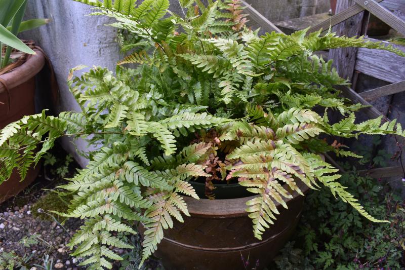Arachniodes simulans erfreut gerade wieder mit frischen Wedeln. Die Form mit rotem Austrieb: