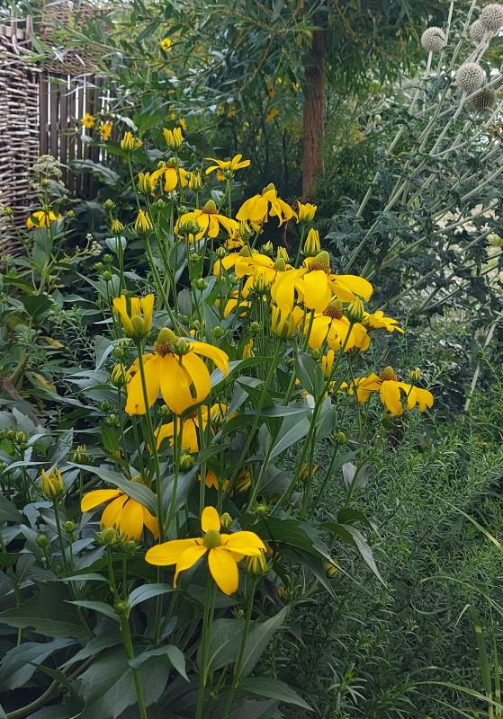 Silphium perfoliatum ist nicht so trockenresistent wie oft behauptet, und standfest auch nicht immer. Und eine üble Samenschleuder. Aber schön halt trotzdem. ;D