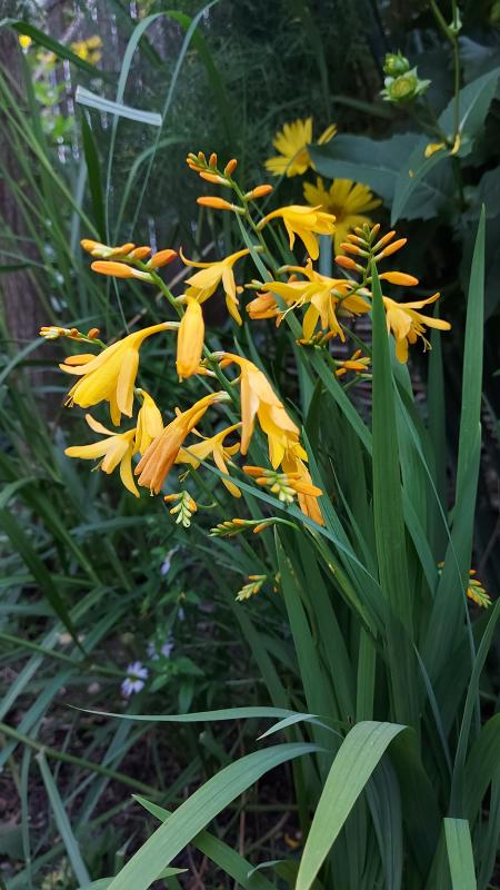Die meisten gelben Crocosmia scheinen nicht so richtige Wuchsmonster zu sein. Die beiden von Dir gezeigten habe ich auch, und die Größenverhältnisse sind auch bei mir so. 'Norwich Canary' hat es sogar geschafft, rückwärts zu wachsen, und war im dritten Jahr perdü. Crocosmia aurea habe ich gerade erst ausgesät; so richtig reingelb ist die aber auch nicht.