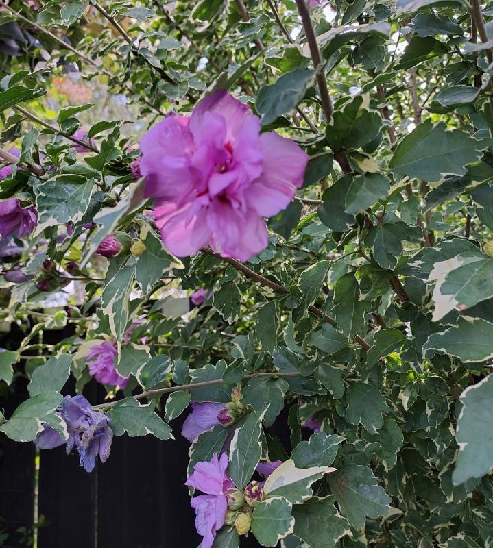 Schwer angeschlagen die Hibiscus syr. panaschiert. Die meisten Knospen verfault.