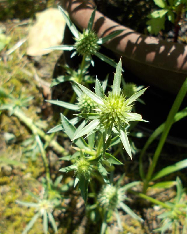 Kleines Update: Das Lungenkraut hatte ich zeitnah aus dem Astilbe-Topf herausoperiert, was aufgrund seines vergleichsweise riesigen Wurzelstocks nicht so einfach war, und es anhand dieser offensichtlichen extremen Vitalität sicherheitshalber kompostiert (obwohl ich es vielleicht auch in eine Gierschfläche hätte pflanzen können, um zu checken, wer der Stärkere ist – aber die Idee ist mir dann erst zu spät gekommen :-X). Nr. 2 hat sich tatsächlich zur Goldrute weiterentwickelt und Nr. 1 zum Eryngium. Anhängig ein Foto des letzteren im Zustand von Anfang Juli; mittlerweile ist die Farbe ins Stahlblaue gewechselt. Könnte E. planum sein, oder?