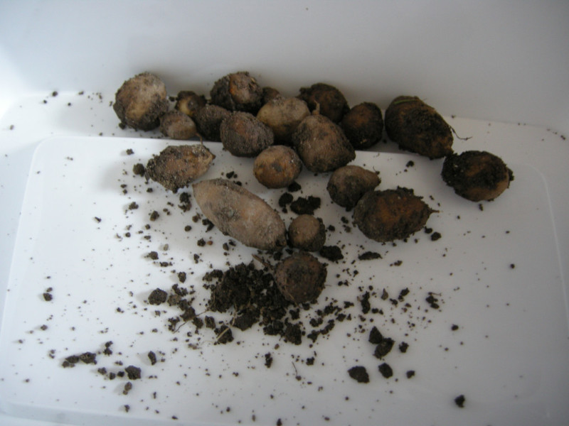 Da ich es vorhin fand: ein Foto von meiner "üppigen" Ernte im letzten Jahr. Also ein sehr exklusives Gemüse! An sich hatte ich ja geglaubt, dass sie ganz verschwunden wären, nachdem das Grün schon bald nach dem Austrieb immer weniger wurde. Aber beim Unkrautjäten vor der Neuaussat fand ich ein paar winzige Knöllchen und habe dann ganz genau weiter gesucht und die Erde durchgesiebt - mit dem Ergebnis lt. Foto.