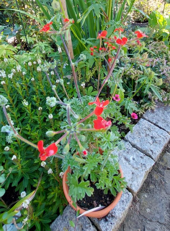 Pelargonie sidoides Burgundy hat die Sintflut relativ gut überstanden. Mir fehlt ein Stück überdachte Terrasse.