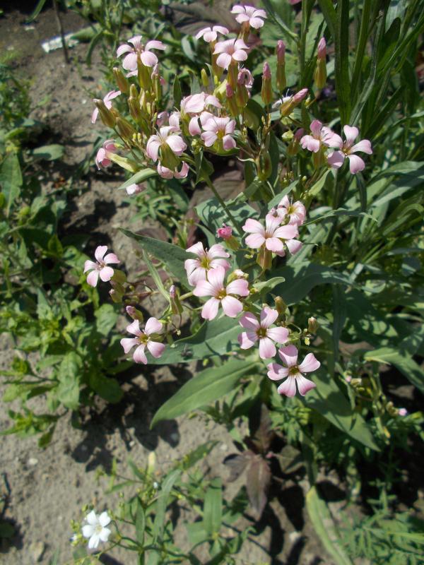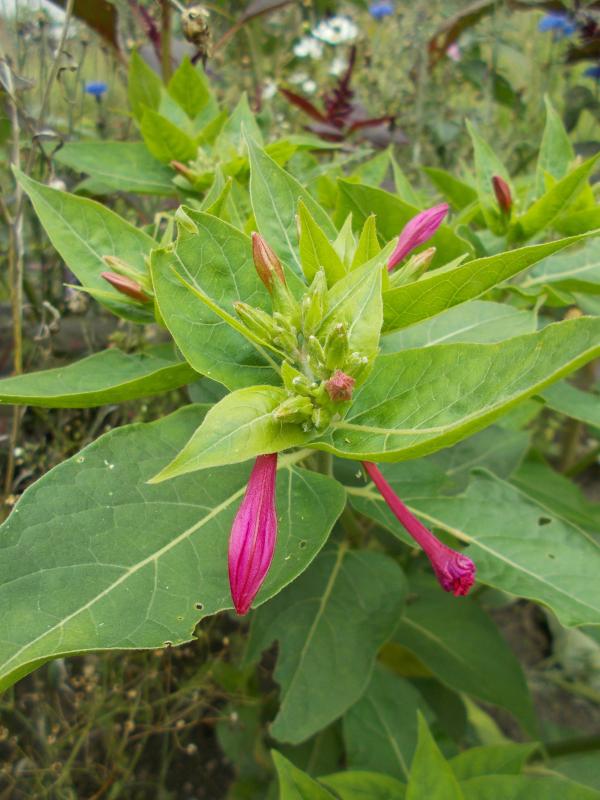 Gleich noch ein paar Wackel- oder Keine-Ahnung-Kandidaten: Im Frühjahr habe ich eine aus Israel stammende Einjahresblumenmischung ausgesät, und einiges keimte trotz Mai-Trockenheit auch tatsächlich. Die Kornblumen konnte ich problemlos identifizieren, aber es gibt drei Wackel- und zwei Keine-Ahnung-Kandidaten. Das hier könnte Mirabilis jalapa sein, oder? (Blütenöffnungszeiten erst ab Spätnachmittag, dazu leichter Duft.)