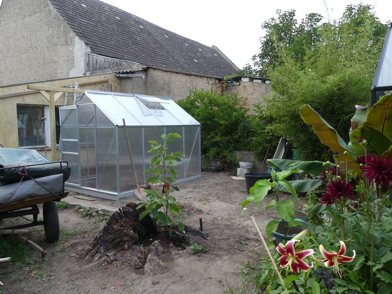 Und da ist sie nun auch. ;) Inzwischen steht auch schon die Pergola hinter dem Gewächshaus und an der Garagenwand sind Balken montiert. Mit einigen verbindenden Sparren wird das eine leichte Schattierung für das Beet, das dort noch entsteht.