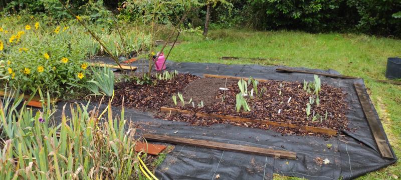Dank des schönen Regen war das Beet inzwischen flächendeckend grün. Ich hasse es so kleines Unkraut zu jäten habe mich aber tapfer bemüht. Und nun sind auch die ersten Wühlmausgeschädigten wieder untergebracht, auch konnten zwei die scheinbar zuwenig Sonne hatten nach hier umziehen.