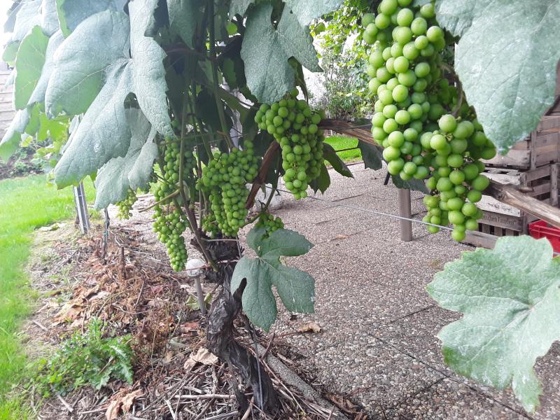 Hier mal ein Foto von meiner Riesenbibeltraube, gekauft hab ich sie (und einen Gutedel) vor ca. 4-5 Jahren von einem Arche-Noah Mitglied. Es ist eine reine vitis vinifera, die uralte Mutterpflanze soll in einem steirischen Kloster wachsen https://sortenhandbuch.arche-noah.at/arten/95-weintraube.