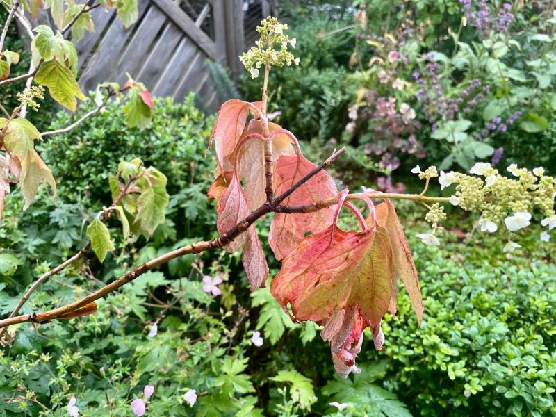 Vielleicht einfach Stress bei dem Extremwetter? Wir haben letztes Jahr im Mai einen Liquidambar gepflanzt, der immer jämmerlicher aussah, große Blattflecken entwickelte, die für eine Pilzerkrankung sprachen (War es aber nicht laut der Meinung von 2 Experten!), und im Herbst schlussendlich wirkte, als würde er eingehen. Im Ergebnis war es wohl eine Stressreaktion auf das Wetter in Kombination mit dem Anwachsen. Ich würde bei der Hortensie die Wasserversorgung im Blick behalten. Die Pfanzen schaffen es bei der Hitze nicht, sich ausreichend mit Wasser zu versorgen. Ein zu nasser Boden ist auch nicht gut, dann sterben die Wurzeln ab. Ein echter Balanceakt.