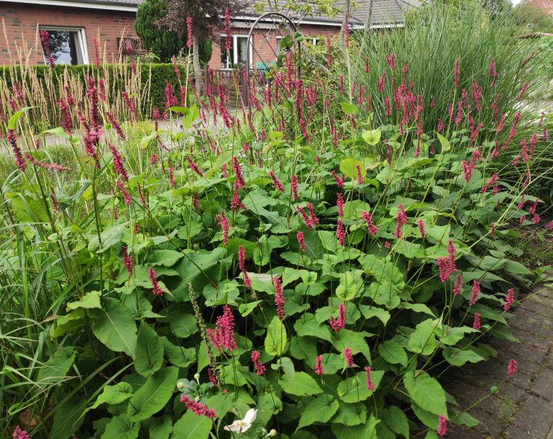 Persicaria 'Firetail' leicht im Hausschatten (Nordseite), aufgenommen gestern. Macht sich zu breit. Schlappt bei längerer Trockenheit.