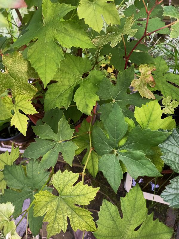 Obacht, Im selben Topf sind auch normale Steckhölzer des Boskoops zu sehen. Stickstoffmangel sieht schlimmer aus als er ist. Ich habe mit DRO fotografiert, um den Kontrast zu erhöhen. Da sieht immer alles schlimmer aus.