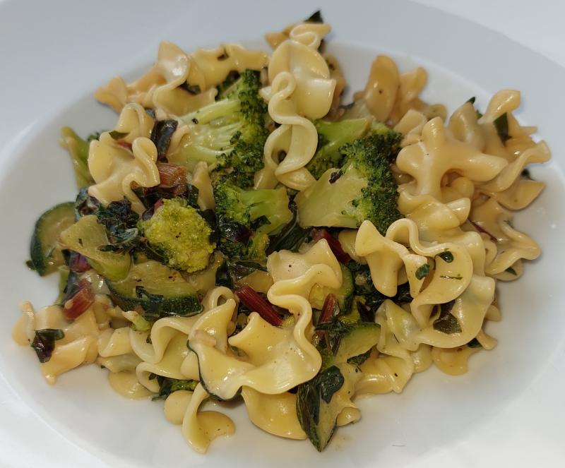 Und heute gab es Soba-Nudeln mit Pimientos de Padron aus eigenem Garten (höllisch scharf), Gartenzucchini, Restchampignons und marniertem und gebratenen Champignons