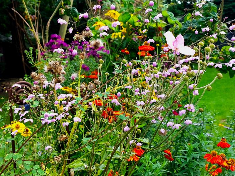 Habe festgestellt, dass ich heuer sehr wenig fotografiert habe. Das lag u. a. an der wochenlangen Trockenheit, da hat vieles kaum oder nicht geblüht (vor allem Clematis), manche Stauden haben auch später als sonst zu blühen begonnen (Helenium, Coreopsis, Aster Lutetiia...). Hier mal ein Foto aus dem Senkgartenbeet. An den 3 Rankgittern, wachsen alpinas, die aber nicht in die Pötte kommen.