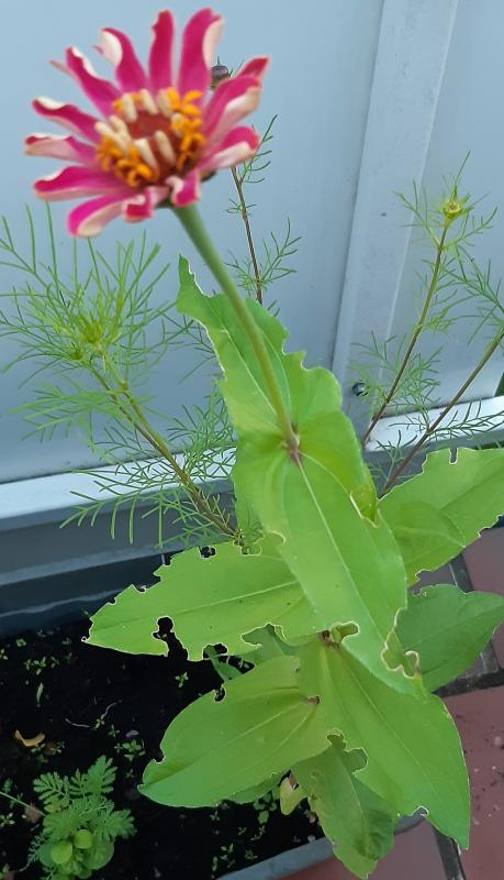 Danke für die Bestimmung, Hortus und APO! Es ist wahrscheinlich eine Zinnie...aus einer bienenfreundlichen Saatmischung. :)