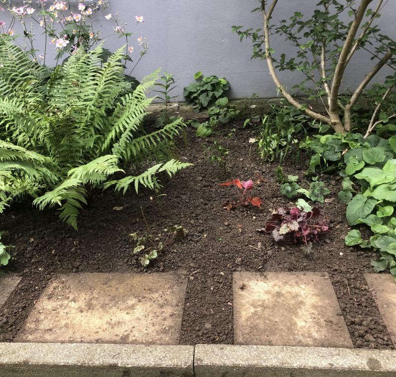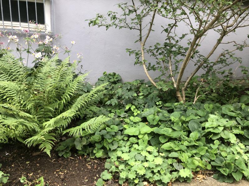 Gestern habe ich angefangen diese Stückchen des Beetes von Anemone, Brunnera und alchemilla mollis zu befreien.