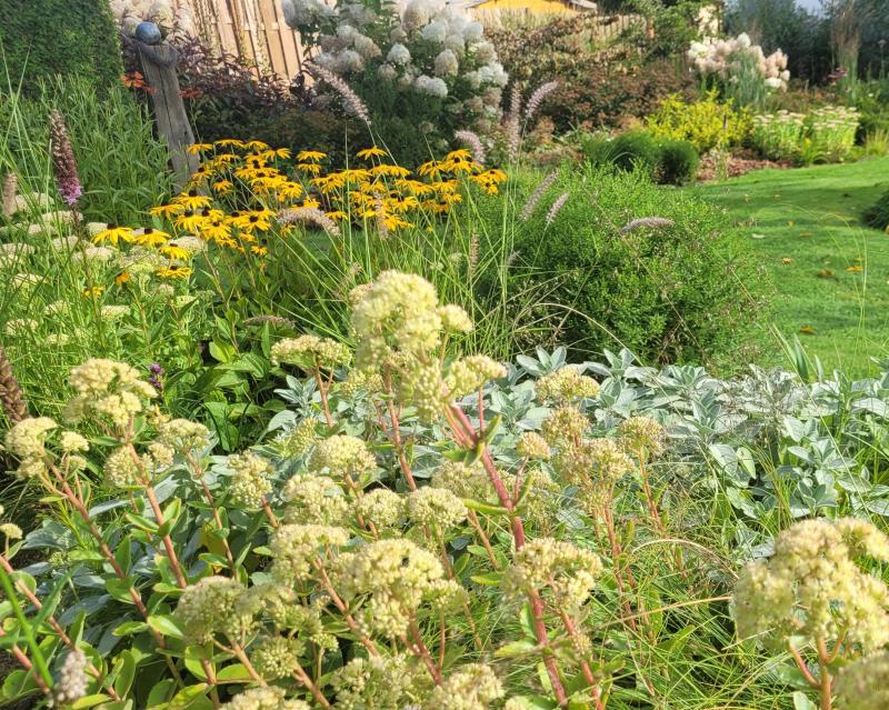 Hier starten nun die hohen Sedum in den Spätsommer / Frühherbst... als erste die kleine 'Carl'. ;)