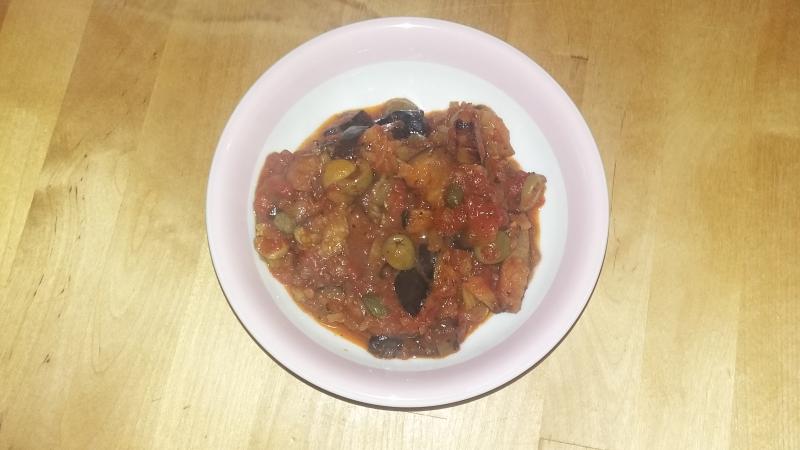 Und da ich gerade bei den Auberginen war, gab es heute eine gefüllte Aubergine: Sardellen, Knoblauch, Kapern, Fruchtfleisch der Aubergine, Semmelbrösel, Mozzarella - darüber etwas Tomatenpüree; dazu Olivenciabatta.