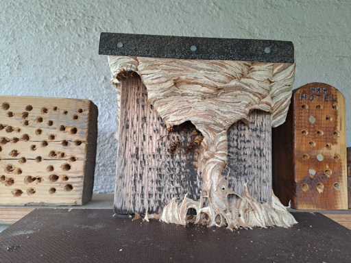 Hallo, die Hornissen waren vor Saisonende noch mal fleißig und haben unseren Nistkasten umgestaltet. Mit dem abgenagten Material haben sie die Fassade verschönert. War immer spannend, da zuzuschauen. Für nächstes Jahr baue ich ihnen einen größeren Kasten.