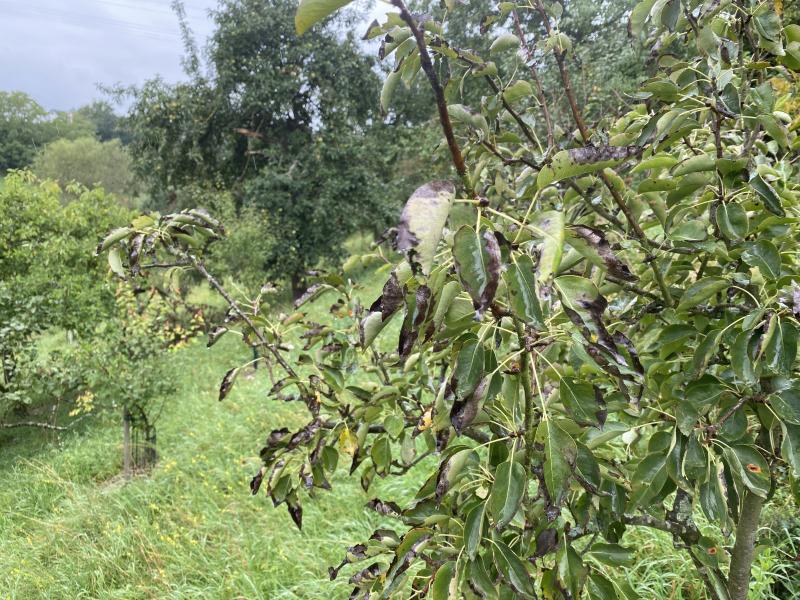 Äste nach Süden voll randnekrotisch, Äste mehr im eigenen Schatten und nach Norden nur an den Spitzen. Pünktlich nach den Hitzewochen sichtbar werdend. Birnen natürlich Totalschaden. Von der hab ich in zehn Jahren einmal zwei Birnen geerntet.