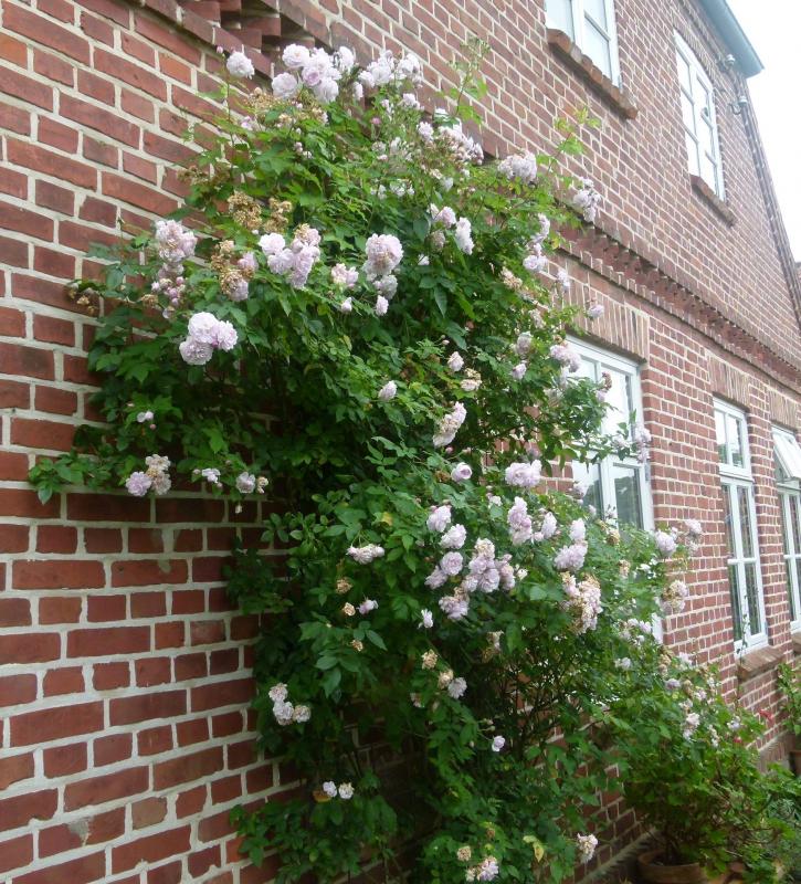Ich hab eben mal hier herumgestöbert. Meine Narrow Water steht hier seit 2006 auf eigenen Füßen. Ich hatte sie aus Stecklingen gezogen, entweder aus dem Rosenpark in Labenz oder aus Raphaelas Garten, das weiß ich nicht mehr. Sie steht an der Rückseite einer mehrteiligen Mülltonnenbox die oben eine Pergola hat. Die Pflanze hier ist sehr wüchsig und ich muss immer ziemlich rigoros schneiden. Vielleicht ist so so einfach wüchsiger als eine auf eine Unterlage veredelte.