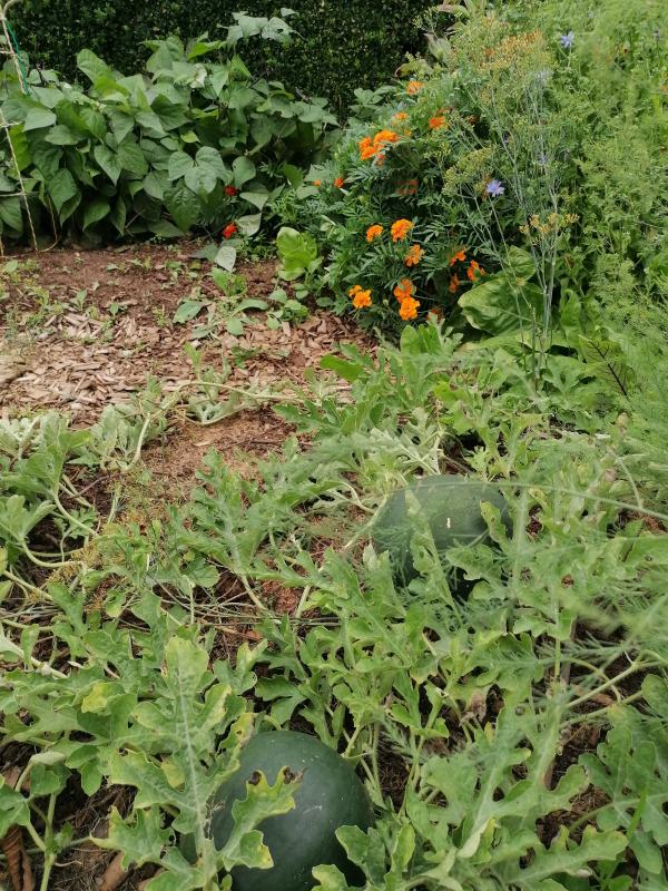 Dann kommen ein paar leere, nur gemulchte Beete - da standen die Kartoffeln. Wegen des späten Starts und des trockenen Frühsommers hatte ich befürchtet, dass die Ernte miserabel wird, war sie aber nicht. Knapp zwei Zentner Linda und Adretta sind im Keller. Die Asia-Senfkohle sind gesät und gekeimt, aber noch zu klein, um auf dem Bild erkennbar zu sein. Die verschiedenen Radicchio stehen gut und werden beerntet. Den Gurken habe ich nach einem heftigen Mehltaubefall ein Großteil der kranken Blätter entfernt, sie haben sich erstaunlich gut berappelt und tragen wieder. Im Hintergrund wachsen Knollensellerie, Mais, ein paar Auberginen und Zucchetta ...