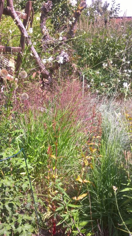 So sieht Shenandoah bei mir aus. Wenig Rotfärbung, aber die Masse an dunkelroten Blüten ist auch sehr hübsch. Rechts das graublaue ist Schizachyrium Twilight Zone.