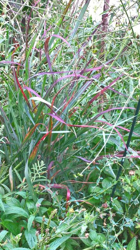 Panicum Hot Rod, junge Pflanze. Nur 1 von 5 färbt überhaupt, die anderen sind eher unscheinbar.