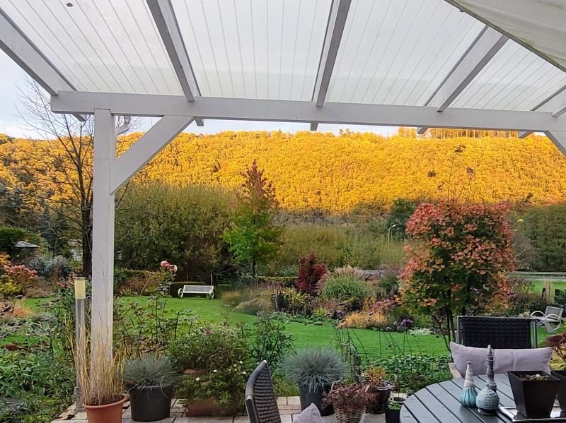 Gestern schon nach 18 Uhr. Die kürzer werdenden Tage machen sich bemerkbar... ich habe mir die Kamera geschnappt und mal ein paar Fotos aus den Fenstern unseres Hauses gemacht. Die Bodentiefen Fenster an drei Seiten des Wohnzimmers sind bis auf die Türen starr... Deshalb die Reflektionen im Glas: