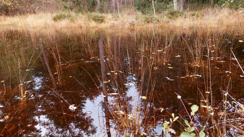 Kleinerer Tümpel tief im Wald - war im Sommer komplett trockengefallen, in der Zeit hatten sich einige Gräser angesiedelt, die jetzt filigran aus dem