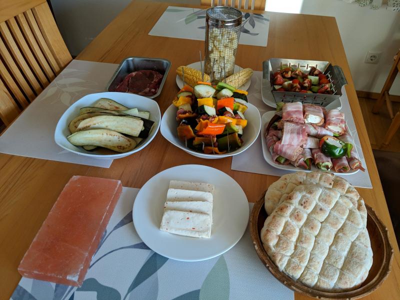 Hier ein Bild kurz bevor es auf den Grill gekommen ist: Links am Bild Melanzani, in der Mitte Spieße mit Paprika und Zucchini, dahinter Kukuruz und Karfiol (im Käfig), rechts in Speck gewickelte Okra, mit Schafkäse gefüllter Paprika, Tomaten und Tomatillos.