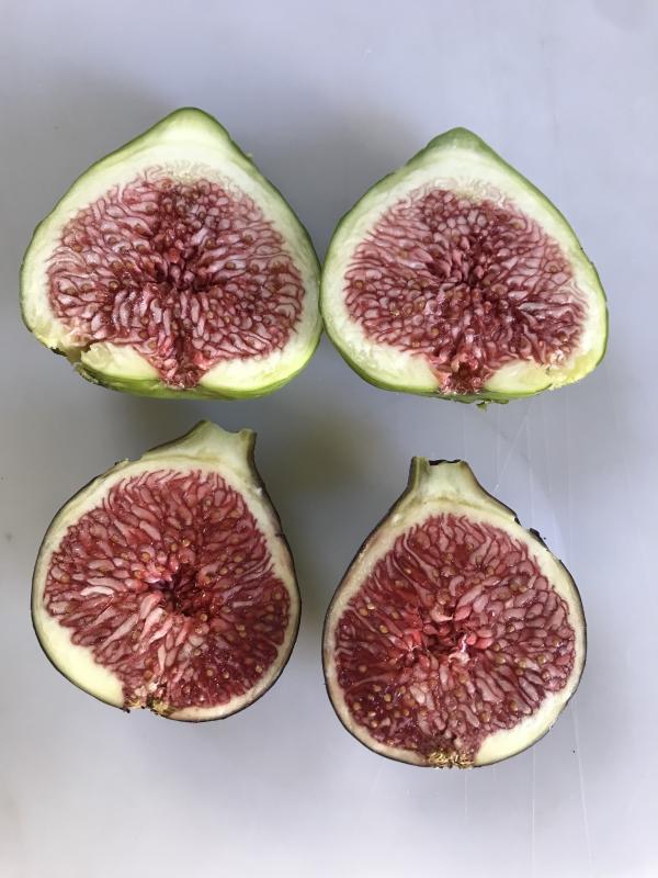 Lady Gaga, danke für Dein Feedback. Bin mir nicht sicher, ob wir die gleiche Sorte haben; aber gewisse Ähnlichkeiten stelle ich schon fest. Ganz typisch bei meiner unbekannten Sorte ist der Hohlraum in der Mitte (insbesondere bei den Herbstfeigen). Und wenn man sie lange hängen lässt, ist das Fruchtfleisch dann bernsteinfarben; und sie schmecken dann auch intensiver. Die trockenen Kerne in der Mitte kommen bei mir auch manchmal vor. Die von Dir beschriebene „samtige“ Haut ist bei meiner Sorte auch der Fall. Hier ein aktuelles Foto von einer Herbstfeige, aufgeschnitten. Ist übrigens bei mir eine sehr produktive Sorte, was Herbstfeigen anbelangt. Sie macht auch große Blütenfeigen, die aber weniger zahlreich sind.