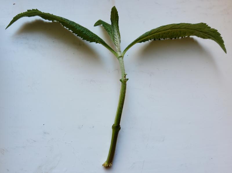Schnitt schräg oberhalb eines Blattknotens, 2 Blattpaare drangelassen. Das Gefäß zum Bewurzeln hatte undurchsichtige Wände (mit dünner Pappe umhülltes Fläschchen), das scheint vorteilhaft.