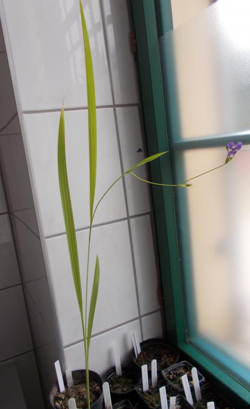 In einem Topf, wo ich Strumaria chaplinii gesät hatte, keimte diese Pflanze hier – offensichtlich keine Strumaria, sondern ein Vertreter der Iridaceae. Aber welcher? Hier zunächst ein Ganzkörperfoto …