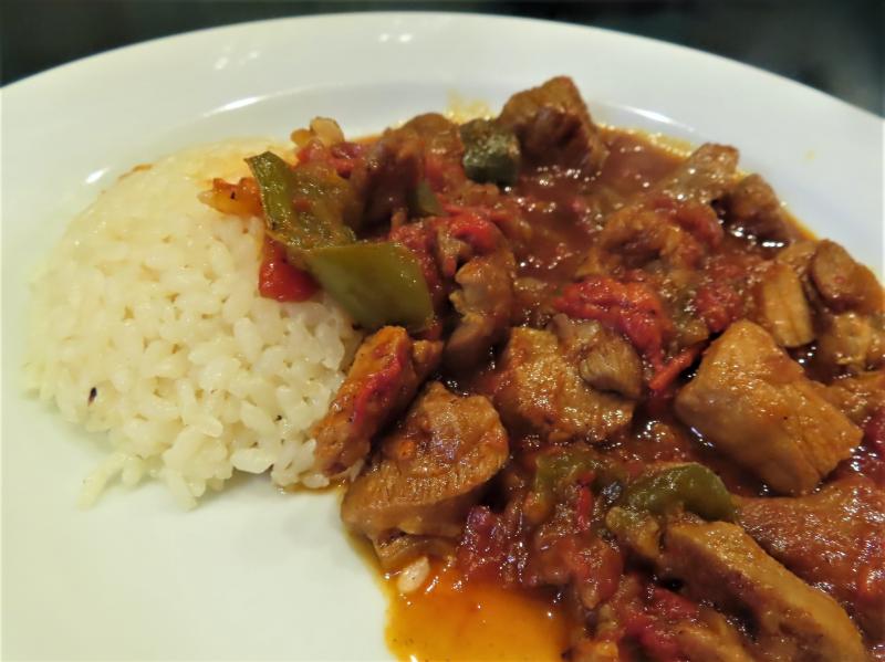Hier gab es Schnellgekochtes, der Hofgarten ist nach der langen Zeit ziemlich pflegebedürftig: Gulasch vom Putenschenkel mit Tomaten, grünem und rotem Paprika, dazu gedünsteter Rundkornreis und Grazer Krauthäuptlsalat. Gut :)