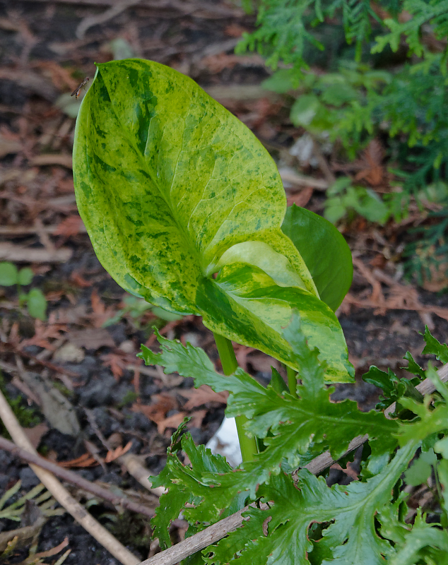Wir haben im Garten ein Arum stehen, dass ich als Arum italicum ‚Pictum‘ gekauft habe. Er ist derzeit ist derzeit noch nicht ausgetrieben. Ich mache dann später ein Foto. Er zeigt viel Weiß.
