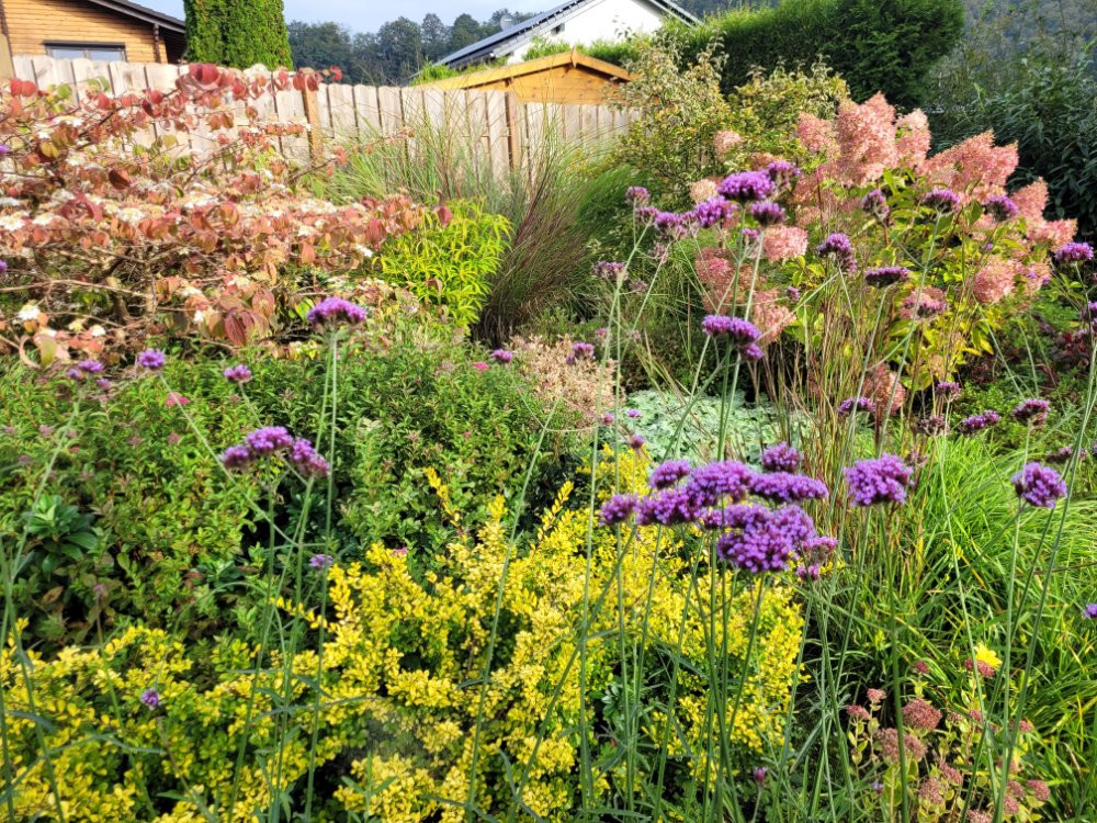Ja, mir gefällt V. bonariensis auch noch etwas besser. Ich sehe 'Lavender Spires' als schöne Ergänzung mit einer ganz anderen Wuchsform. Mit dem zusätzlichen Vorteil, dass sie nicht ganz so aufdringlich und zudem steril ist. Es ist manchmal etwas nervig, wie stark sich V. bonariensis versamt. Ich mag auch V. hastata sehr gerne, die allerdings hier nicht so stabil sind . Trockenheit mögen sie nicht so und verschwinden dann gerne.Eckhard hat geschrieben: ↑15. Okt 2024, 09:34 Ich habe "Lavender Spires" dieses Jahr auch erstmalig und sie blüht wirklich ewig! Gefällt mir sehr! V. bonariensis finde ich allerdings etwas schöner. Die "Lavender Spires" fängt im Laufe des Sommers an, kopflastig herumzuhängen und ich muss sie stützen.