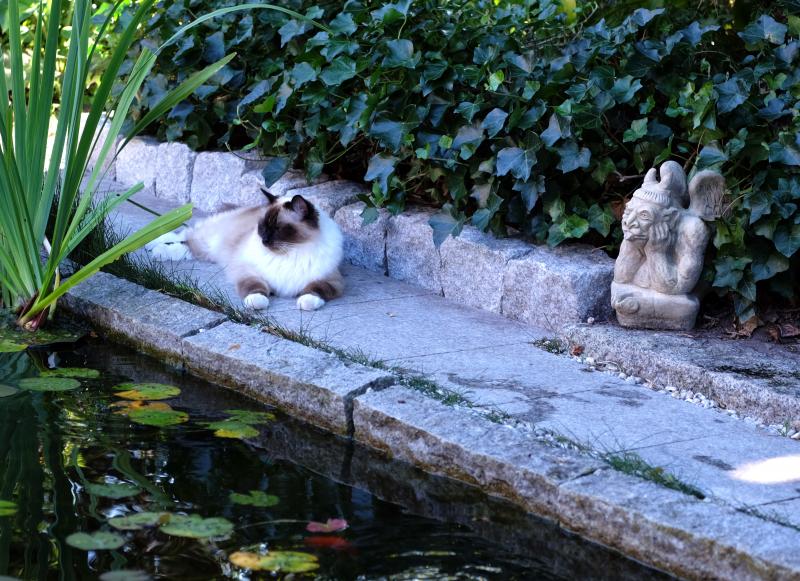 Eberhard ist seit gestern nicht mehr da. :-[ Ich mache mir Sorgen, auch weil meine Katze gestern Abend triefend nass ins Haus kam. Dabei saß sie ihm immer so entspannt gegenüber.
