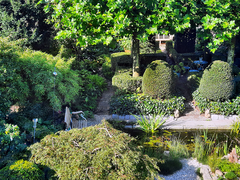 Secret Garden hat die Attribute für Deinen Garten gut zusammengefasst, die Dachplatanen, Buchshecken, der rechteckige Teich usw. geben dem Garten eine gewisse Eleganz, und die zurückhaltende, aber dennoch üppig grüne Bepflanzung sind so ganz anders als meine überbordenden Beete, wo alles kreuz und quer wächst. Manchmal hätte ich gerne so einen "aufgeräumten" Garten, aber selbiger wächst mir dann doch wieder über den Kopf, formt dabei aber dennoch irgendwie eine romantische Szenerie. :)
