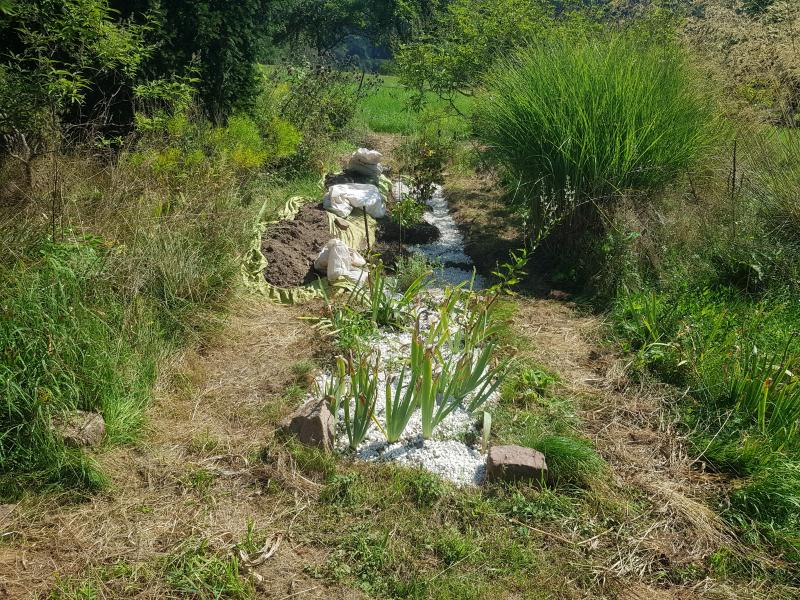 so, die dritte neue Irispflanzung. Zwei große Bestände Bergenien weg, Morgenröte und Baby Doll, und schon ist Platz für Bart-Iris. Erde raus, Terrakottabruch ausgelesen und Jurakalksplitt rein 6 Eimer.